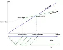 Propagating seismic waves (bottom) and related travel time diagram (top) of the direct (blue) and the first refracted phase (green)