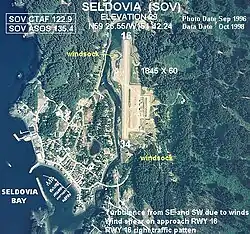 Seldovia Airport is a public-use gravel airstrip serving Seldovia, Alaska, about 15 miles (27 km) south-southwest from the fishing town of Homer at the Kenai Peninsula's "end of the road." The two towns are separated by Kachemak Bay, a blue-water arm of the North Pacific Ocean's Gulf of Alaska. Known to pilots as "Seldovia" (or more formally, (IATA: SOV, ICAO: PASO, FAA LID: SOV)),[2] this public airport is located less than a half-mile (2 km) northeast of the small boat harbor serving Seldovia in the Kenai Peninsula Borough, Alaska, United States. This airport is publicly owned by the State of Alaska Department of Transportation and Public Facilities (DOT&PF) - Central Region.[1] A two-lane gravel street named Airport Avenue leads about a half-mile (1 km) from the airport to the center of Seldovia at the Small Boat Harbor, which is surrounded by several cafes, businesses, and small hotels.
