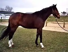 The Selle Français is generally bay or chestnut in color, the latter being a legacy of its origins in the Anglo-Norman breed. Gray is much less common, with its origins in the Thoroughbred and Anglo-Arabian horses that contributed to the breed. White markings, such as white on the lower legs, are fairly common within the breed, and are again inherited from its Norman ancestors.[1][5] The temperament of the Selle Français is highly variable from one horse to another. This is due to the selection criteria for breeding stock, which since the beginning of the breed have been based on physical ability. In recent years, however, the ANSF and breeders have been working to create selection criteria that focus on temperament. The vast majority of Selle Français have good temperaments, quiet but energetic, patient and friendly.[3][6] The breed is reputed to be intelligent and quick to learn.[4]