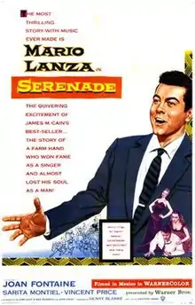 Serenade is a 1956 American musical drama film directed by Anthony Mann and starring tenor Mario Lanza, Joan Fontaine, Sara Montiel (billed as Sarita Montiel), and Vincent Price. Based on the 1937 novel Serenade by James M. Cain, the film was a Warner Bros. release, Lanza's fifth film, and his first on-screen appearance in four years.