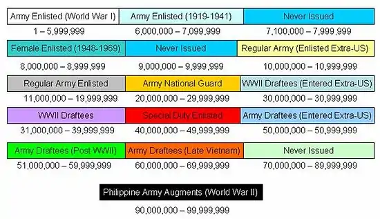 A final service number series of World War II was the ninety million series (90 000 000 to 99 999 999) which was reserved for members of the Philippine Army who had been called up to serve in the ranks of the U.S. Army. These numbers were rarely issued and the ninety million series was permanently discontinued after World War II.