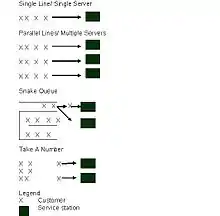When demand exceeds capacity, customers may have to wait for services. Lovelock identifies a range of different types of waiting lines or queuing systems:[38]