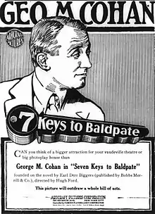 Seven Keys to Baldpate is a 1917 American silent mystery/thriller film produced by George M. Cohan and distributed by Artcraft Pictures, an affiliate of Paramount.[1] The film is based on Cohan's 1913 play of the 1913 novel by Earl Derr Biggers. Cohan himself stars in this silent version along with Anna Q. Nilsson and Hedda Hopper, billed under her real name Elda Furry. One version of the play preceded this movie in 1916 and numerous versions followed in the succeeding decades such as the early RKO talkie starring Richard Dix.[2]
