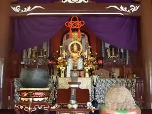 The wooden Avalokiteśvara statue, enshrined in the main hall, has been an object of significant religious reverence. It was designated a Cultural Property of Japan by the government in 1906. On October 4, 2009, a theft of the Buddha statue occurred.[2] The thief entered the temple and stole the statue from the main hall. However, the statue was recovered in December of the same year. Shoe marks left behind indicated that multiple criminals were involved, and it is believed they broke into the main hall by cutting the padlock.[3]