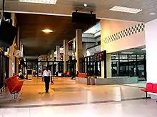 The airport's sole 220,000 square feet (20,000 m2) passenger terminal is divided into two parts: International and Domestic with a boarding bridge in each.[6] The International part of the terminal is larger than the Domestic one due to higher number of passengers.[6] The building is divided into two floors: The lower floor is used for checking in, boarding or getting off small planes, and receiving luggage. The upper floor is used for boarding or getting off large planes only.[6]
