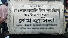 Shah Amanat International Airport, Chattogram (IATA: CGP, ICAO: VGEG) (Bengali: শাহ আমানত আন্তর্জাতিক বিমানবন্দর, চট্টগ্রাম, Shah Amanôt Antôrjatik Bimanbôndôr ćhottoģŕàm ) is an international airport serving Bangladesh's southeastern port city of Chittagong. Operated and maintained by the Civil Aviation Authority of Bangladesh, it is the second-largest international airport in Bangladesh after Shahjalal International Airport in Dhaka, Bangladesh. It is used by the Bangladesh Air Force as a part of 'BAF Zahurul Haq Base'. It was formerly known as MA Hannan International Airport, named after Awami League politician M. A. Hannan, but was renamed on 2 April 2005 by the Government of Bangladesh, after an 18th-century Islamic saint, Shah Amanat. It is capable of annually handling 1.5 million passengers and 6,000 tonnes of cargo.[3] It also serves as a base for the Arirang Flying School.[4]