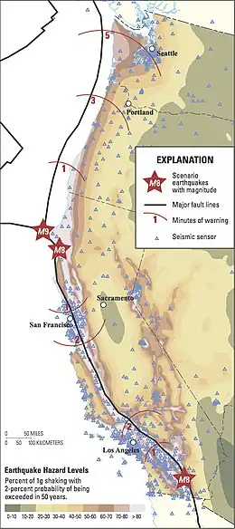 Map showing the amount of advance warning time that might be available from ShakeAlert for several plausible future earthquake scenarios.[1]