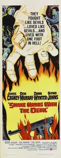 Shake Hands with the Devil is a 1959 British-Irish film produced and directed by Michael Anderson and starring James Cagney, Don Murray, Dana Wynter, Glynis Johns and Michael Redgrave.[3] The film was based on the 1933 novel of the same title by Rearden Conner, the son of a Royal Irish Constabulary policeman.