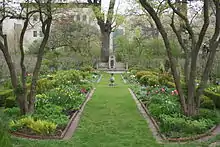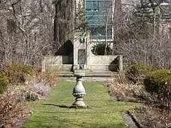 The Shakespeare Garden is located on the Northwestern University campus at the corner of Sheridan Road and Garrett Place, near the Howes Chapel and Garrett–Evangelical Theological Seminary.[2] The garden is 70 feet (21 m) wide by 120 feet (37 m) long and is divided into eight flower beds. The four outer beds are designed informally, while the four inner beds are knot gardens; the outer and inner beds are separated by boxwood plants. The borders of the garden are lined with hawthorn trees, many of which were imported from France when the garden was first planted.[3] The more than fifty varieties of plants in the garden were either mentioned in Shakespeare's works, common in the Tudor period in England, or are cultivars of plants in the other two categories.[3] The garden also includes a fountain with a plaque honoring Shakespeare and a stone memorial designed by Hubert Burnham, the son of architect Daniel Burnham.[4]