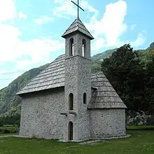 The etymology of Shala is unclear. It has been connected to the Albanian term shalë(sinë) denoting an arid or infertile land, however, this etymology does not seem likely considering that the Shala Valley is among the only regions in the Albanian Alps suitable for agriculture.[1] Folk tradition connects their tribal name to the word shalë ("saddle"), a reference to the legend in which the ancestor of the Shala was given a saddle by his brothers as they departed from one another.[2]