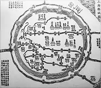 There may have been some sort of defensive works around the county seat of Shanghai from the 11th century.[1] The city wall, which survived until the 20th century and parts of which remain to this day, was, however, built in 1554 during the Ming Dynasty, in order to protect the town from raids by Japanese pirates. It measured 10 metres (33 ft) high and 5 kilometres (3.1 mi) in circumference.[2] In addition to the local garrison, the city was surrounded by Qing army posts at Jiangning (Nanjing), Jingkou (Zhenjiang), Hangzhou, and Zhapu.[3]