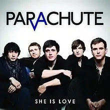 "She Is Love" is the debut single by American pop rock band, Parachute, and is the lead single from their debut album, Losing Sleep. It was released on May 13, 2009. It is their only song to enter the Billboard Hot 100 to date, peaking at #66. The song is also their most successful single to date, as it entered the Adult Alternative Songs, Adult Contemporary, Adult Pop Songs, Heatseekers Songs, Japan Hot 100 charts and is certified Gold by the RIAA. The album version was produced by Chris Keup/Stewart Myers. The full band version was produced by Kyle Kelso. Songwriter Will Anderson said that he tried to write a very simple love song that he could sing in front of a room full of girls he was trying to get to come to a show.[1]