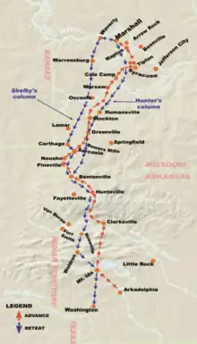 ![]() Map of Shelby's route. Shelby's Raid started in Arkadelphia, Arkansas, and crossed into Missouri near Pineville. The raid targeted Neosho, Greenfield, Humansville, and Warsaw. Shelby's forces broke through Marhsal, then retreated through Waverly and Carthage, and finally back into Arkansas. | |||||||