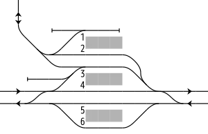 The station has three island platforms serving six tracks connected by a footbridge. Track one terminates at this station. The station is staffed.