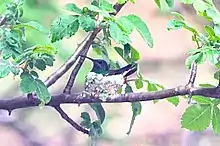 The shining-green hummingbird's breeding season spans from October to March. Its nest is a small cup of plant down and cobweb with lichens on the outside. It is typically placed on an outer branch of a tree or shrub between 1 and 1.5 m (3 and 5 ft) above the ground. Nothing else is known about the species' breeding phenology.[10]