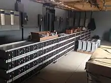SML maintains three diesel generators and two green energy grids to provide electrical power day and night. Green energy grids collect power from the sun with photovoltaic panels and from the wind with a 10 kW Bergy wind turbine.[17] Power collected is stored in sealed absorbed glass mat batteries. There are 52 batteries creating a storage capacity of 388 A·h at a nominal 48 V DC.[18] Stored power is inverted to AC electricity for distribution to the island's 14 buildings. Diesel generators provide backup power. Over the past eleven years, addition of photovoltaic power generation with battery storage, along with sustainability and energy efficiency efforts, has reduced fuel needs by 80%.[19]