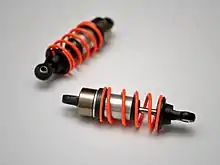 • Fluid friction, for example the flow of fluid through a narrow orifice (hydraulics), constitutes the vast majority of automotive shock absorbers. This design first appeared on Mors racing cars in 1902.[11] One advantage of this type is, by using special internal valving, the absorber may be made relatively soft to compression (allowing a soft response to a bump) and relatively stiff to extension, controlling "rebound", which is the vehicle response to energy stored in the springs; similarly, a series of valves controlled by springs can change the degree of stiffness according to the velocity of the impact or rebound. Specialized shock absorbers for racing purposes may allow the front end of a dragster to rise with minimal resistance under acceleration, then strongly resist letting it settle, thereby maintaining a desirable rearward weight distribution for enhanced traction.