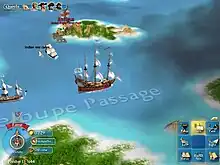The majority of the game is spent sailing from destination to destination around the Caribbean islands. To control their ship the player must use the number pad (or the directional arrows) on the keyboard. Mouse navigation is also possible, where clicking anywhere on the screen will send the ship sailing in that direction. During the sailing segment, the player navigates between areas of interest in the Caribbean, including colonies, cities, missions, pirate havens, and others. Wind conditions have an important effect on sailing, as winds tend to blow westwards (especially on lower difficulty levels) and as such speed up travels to the west while slowing down travel to the east. Clouds passing overhead indicate barometric depressions, and at the centers of these depressions are storms which cause powerful winds, usually assisting sailing in any direction but also posing a threat to any ship passing underneath the storm. Unlike previous versions of the game, the Caribbean is teeming with ships represented visually by their three-dimensional models. The player can spot these ships from a distance and even collect information about their mission, port of departure, destination, and nationality. This allows the player to hand-pick their targets, as well as actively pursue most ships if an attack is to be attempted. Unlike previous Pirates! games, however, enemy ships cannot force the player to fight, although they can bombard the player's ships en route to a destination and even sink some (but not all) of the player's ships if they bombard them long enough. Fortified cities which hold a particular grudge against the player (or whose controlling nation holds a substantial bounty over the player's head) may also open fire upon the player's fleet as it passes by. The player must also navigate around reefs and shoals, which cause hull damage to any ship which passes over them (but rarely sink ships, unlike in previous versions). Finally, if the player wishes, they may sail the ship onto the shoreline, allowing the crew to disembark and begin to march. This can be used when the player wishes to approach a hostile city without being fired upon, to attack a friendly city, or to travel on land seeking buried treasure, lost cities, or Montalban's hideout.