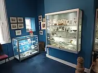 Though the collections change every year, the museum exhibits items in several areas, including but not limited to geology, lace, famous Sidmouthians (including Sir John Ambrose Fleming and Peter Orlando Hutchinson) as well as local history. The museum currently displays a collection of military medals and offers a display recalling Sidmouth during the Second World War. Before the 2021 season, the museum secured several digitisation grants, which provided the opportunity to present many of the museum's offerings in digital form.[4] As a result, visitors can now access a great deal of information via screens and QR codes. Digitisation means that the museum can display much more in an electronic form than would be physically possible in a relatively small building. Almost the entirety of the museum's art collection, for instance, is accessible via interactive screens.[9]