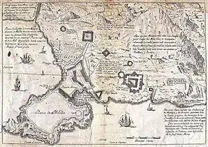 The siege of Melilla was an attempt by the Sultanate of Morocco, supported by Great Britain and Algerian mercenaries,[2] to capture the Spanish fortress of Melilla on the Moroccan Mediterranean coast. Mohammed ben Abdallah, then Sultan of Morocco, invaded Melilla in December 1774 with a large army of Royal Moroccan soldiers and Algerian mercenaries. The city was defended by a small garrison under Irish-born Governor Don Juan Sherlocke until the siege was lifted by a relief fleet in March 1775.