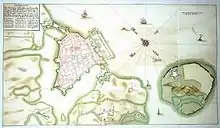 Frederick William I positioned his artillery south of the town and started bombardment on 10 October 1678.[1] His aim was to force Swedish commander Otto Wilhelm von Königsmarck[7] into surrender by abundantly firing incendiary bombs on the burghers' mansions.[1] The small, newly created Brandenburgian navy also took part in the siege.[8]