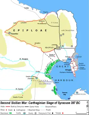 Himilco led the Carthaginian army (50,000 men, 400 triremes, and 600 transports) to Sicily in 397 BC.[14] When the Carthaginians reached Syracuse, their war fleet had shrunk to 208 ships, though 2,000 transports had been employed to carry supplies to the army.[15] The number of soldiers in Syracuse is unknown, as some garrisoned the Carthaginian possessions, and the Carthaginians had been reinforced by Sicels, Sikans and Elymians after arriving in Sicily.