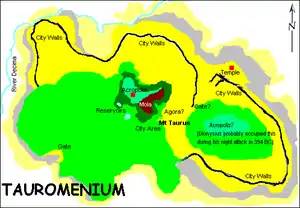 The city of Tauromenion was built atop the 200 m high Mt. Taurus, surrounded by ravines and walls that covered the most vulnerable places. The main acropolis was built on the highest point and overlooks the town, being 212 m from sea level. The Sicel town is said to have another acropolis, which probably occupied the place of the Greek Theater. The western gate of the city was situated on the south wall. The city overlooked the site of Naxos, which was the first Greek colony in Sicily, and from that place the aggression of the Greeks against Sicels began. The Sicels were determined to hold on to Tauromenium, which was a gift from Carthaginians who had never attacked them, and had enabled them to recapture the lands of their forefathers.[22]