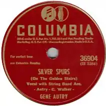 "Silver Spurs (On the Golden Stairs)" is a country music song written by Cindy Walker and Gene Autry, sung by Autry, and released in 1946 on the Columbia label (catalog no. 36904). In February 1946, it reached No. 4 on the Billboard most-played folk chart.[1] It was also ranked as the No. 27 record on the Billboard 1946 year-end folk record sellers chart.[2]