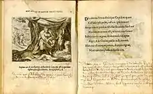 Initially the depiction of this motif were closely tied to text and was found mostly in emblem books, with the first appearance in the Picta poesis of 1552, by Barthélemy Aneau.[17] The Mikrokosmos, an emblem book of 1579 by the Dutch poet Laurentius Haechtanus may be the first depiction of the shivering Venus, as Ceres and Bacchus walk away.[18] The Latin text makes clear that the motif is to be understood as a warning against excessive feasting and drinking because they stimulate sexual desire: