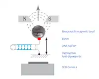 The DNA molecule of interest must be incorporated into a hairpin, and attached to a magnetic bead on one end and to an immobile glass surface on the other end. The hairpin is attached to the glass surface via a digoxigenin-antidigoxigenin bond.[1] The magnetic bead is attached to the opposite end via biotin-streptavidin interaction.[1] Such DNA hairpin setup can be made in two ways: