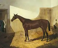 The colt who would become Sir Tatton Sykes was bred near Driffield by a farmer named Hudson. He was a bright bay horse standing 15.2 hands high with large, drooping ears, a white blaze and one white foot and was described as having a "quiet and docile" temperament.[1] He was sired by Melbourne, a member of the Godolphin Arabian sire-line who went on to get the Triple Crown winner West Australian and the outstanding filly Blink Bonny.[2] His dam, an unnamed mare by Margrave went on to produce the important broodmare Lady Elizabeth.[3]