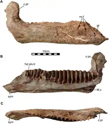 Described in 2015 by Thai palaeontologists Masateru Shibata, Pratueng Jintasakul, Yoichi Azuma and Hai-Lu You, Sirindhorna was one of eighteen dinosaur taxa from the year to be described in an open access or free-to-read journal.[1][3] It's the third species of iguanodont found in Thailand, following Siamodon and Ratchasimasaurus, both known from poorer material, and the first ornithopod from Southeast Asia to have a well-preserved skull. The type and only species of the genus is Sirindhorna khoratensis. The taxon is known from the holotype specimen NRRU3001-166, an articulated braincase, as well as a number of disarticulated referred specimens. The material known from these referred specimens consists of three more partial braincases, one with an articulated postorbital, one right premaxilla, a left and right maxilla, a right jugal, surangular, and quadrate, one predentary, a right and left dentary, and assorted teeth. The generic name is dedication to Princess Maha Chakri Sirindhorn for her contribution to the support and encouragement of palaeontology in Thailand. The specific name is derived from Khorat, the informal name of Nakhon Ratchasima Province.[1]