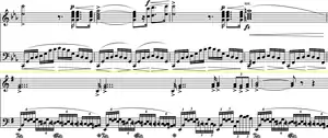 The second piece, referred to as a "glittering showpiece", is positioned in contrast to the lyrical and "atmospheric" melody of the first piece.[8] The piece is in the quick tempo allegretto (quickly), at quarter note = 92. It is 131 measures long, the most of all six pieces,[14] but the second shortest in terms of playing time, usually no longer than three and a half minutes (the shortest is number four).[2] This piece represents a typical nineteenth-century étude, similar in style to Frédéric Chopin's Études (Opp. 10, 25), with a melody interspersed between rapid sextuplet figures.[2] It is in strict ternary form with a coda: identical beginning and ending sections beginning on measures 1 and 85, and a contrasting middle section starting on measure 45. The second section radically changes dynamics, constantly changing from piano to fortissimo and even sforzando.[14] It is, throughout, a relentless torrent of descending half steps and a cascading left hand figure reminiscent of Chopin's Revolutionary Étude (Op. 10, No. 12, 1831).[2] Ending the piece is a slow coda in Adagio (at ease) which closes with a plagal cadence in E minor.[14]
