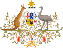 Ultimately, out of all pre-decimal coinage, the sixpence is the only coin whose reverse was not altered. The reverse consisted of a coat of arms approved by Edward VII in the year 1908.[5] The main feature of the arms was a shield derived from the Australian coat of arms, which was supported by a kangaroo and an emu and a seven-pointed star as the crest, as well as the words 'Advance Australia' on the scroll underneath.[5] This is considered surprising as the 1908 coat of arms symbol was changed in 1912 within Australia, and as such was obsolete for most of the pre-decimal currency period.[11] The new version of the coat of arms did not appear in the correct form until the 1966 50 cent piece.[7]