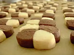 a shortbread cookie split between vanilla and cocoa-flavored dough in a checkerboard pattern |