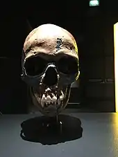 Qafzeh 25 was discovered in 1979. Due to his overall robustness and tooth wear, the remains are believed to be of a young male.[35] The fossil has undergone heavy taphonomical damages including a complete crushing of the skull and mandible.[36] Its inner ear morphology confirm that it is an anatomically modern human [37]