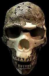The remains exhibit a mix of traits found in archaic and anatomically modern humans. They have been tentatively dated at about 80,000–120,000 years old using electron paramagnetic resonance and thermoluminescence dating techniques.[5] The brain case is similar to modern humans, but they possess brow ridges and a projecting facial profile like Neanderthals. They were initially regarded as transitional from Neanderthals to anatomically modern humans, or as hybrids between Neanderthals and modern humans. Neanderthal remains have been found nearby at Kebara Cave that date to 61,000–48,000 years ago,[6] but it has been hypothesised that the Skhul/Qafzeh hominids had died out by 80,000 years ago because of drying and cooling conditions, favouring a return of a Neanderthal population[7] suggesting that the two types of hominids never made contact in the region. A more recent hypothesis is that Skhul/Qafzeh hominids represent the first exodus of modern humans from Africa around 125,000 years ago, probably via the Sinai Peninsula, and that the robust features exhibited by the Skhul/Qafzeh hominids represent archaic sapiens features rather than Neanderthal features.[7] The discovery of modern human made tools from about 125,000 years ago at Jebel Faya, United Arab Emirates, in the Arabian Peninsula, may be from an even earlier exit of modern humans from Africa.[8] In January 2018 it was announced that modern human finds at the Mount Carmel cave of Misliya, discovered in 2002, had been dated to around 185,000 years ago, giving an even earlier date for an out-of-Africa migration.[9][10][11][12]
