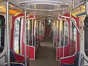The original fleet consists of 12 metres (39 ft 4+1⁄2 in) lightweight Mark I ICTS cars from Urban Transportation Development Corporation, similar to those used by Line 3 Scarborough in Toronto (until its closure in July 2023) and the Detroit People Mover.[8] Mark I vehicles are composed of mated pairs and normally run as six-car trains, but can also be run in two- and four-car configurations. The maximum based on station platform lengths is a six-car configuration, totaling 72 metres (236 ft 2+5⁄8 in) The SkyTrain fleet currently includes 150 Mark I trains.[9] These trains have side-facing seats; red, white, and blue interiors; and two doors per car. However, some repainted units feature only blue and white interiors.