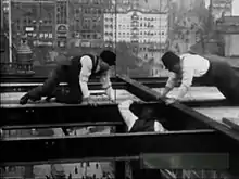 Charles Musser remarks that both Skyscrapers and another film produced by Biograph in 1906, The Tunnel Workers "involve melodramatic confrontations between men from different levels of management, and both were shot on locations that received significant news coverage." He notes the contrast between the actuality material included at the beginning of the film (five first shots) and the scenes shot on location with professional actors which display "a wide range of presentational elements (conventionalized acting gestures, melodramatically contrived plots) with the result that an informal, spontaneous, catch-as-catch-can style of filming suddenly shifts to old-style theatrical conventions as quotidian space is turned into a stage."[2] Ilaria Serra stresses the interest of the first five shots: the introductory panoramic from a camera placed on a skyscraper "gives a unique view of an infant New York, its rooftops, a cupola, buildings, and some surviving trees. The camera then turns toward the groups of workers (...) There is always someone who stares at the camera and gives spontaneity to the scene, reminding us that these are not actors. The camera moves on to two breathtaking subjects: a group of workers climbing on big iron bars—the bone structure of the skyscraper and remaining suspended there and four other workers in groups of two hanging from the iron rope of a huge crane and moving through the emptiness [followed by] a camera movement that shows buildings and factories."[6]