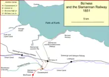 The directors obtained a further Act of Parliament, on 3 July 1851 confirming the powers to acquire land, and authorising a number of deviations, including the power now to build a fixed bridge over the Union Canal. The inhabitants of Bo'ness demanded, and got, a promenade on the sea side of the new railway line.[1]