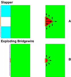 A slapper detonator, also called exploding foil initiator (EFI), is a detonator developed by Lawrence Livermore National Laboratory, US Patent No. 4,788,913 (Filed 1971, Granted 1988). It is an improvement over the earlier exploding-bridgewire detonator. Instead of directly coupling the shock wave from the exploding wire (as the bridgewire does), the expanding plasma from an explosion of a metal foil drives another thin plastic or metal foil called a "flyer" or a "slapper" across a gap, and its high-velocity impact on an explosive (for example, PETN or hexanitrostilbene) then delivers the energy and shock needed to initiate a detonation. Normally all the slapper's kinetic energy is supplied by the heating (and hence expansion) of the plasma (the former foil) by the current passing through it, though constructions with a "back strap" to further drive the plasma forward by magnetic field also exist. This assembly is quite efficient; up to 30% of the electrical energy can be converted to the slapper's kinetic energy. The device's name is derived from the English word 'slap'.
