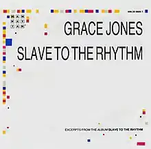 "Slave to the Rhythm" was the first single from Grace Jones' album of the same name, which was released in 1985. The song and the album were written by Bruce Woolley, Simon Darlow, Stephen Lipson and Trevor Horn, and was produced by Horn. This was Jones' first album in three years, and it contained eight variations of the same song (the single's B-side is another variation, yet to be released on CD). "Slave to the Rhythm" was originally intended for Frankie Goes to Hollywood as a follow-up to their hit debut single "Relax".[1] A demo version of the song was recorded by the band.[2] The song was assembled and produced by Horn after "Two Tribes", but the project was ultimately given to Jones. Paul Morley says Horn worked on the song endlessly and had hoped it would become one of his biggest and most successful creations.[3]