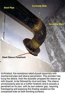 • Metallic sleeves are heatsinks in the firestop that follows the mounting of the penetrants. Maximum and minimum tolerances for wall thicknesses must be taken into account prior to casting. Heatsinks can affect T-ratings. Organic sealants used for topcaulking in firestops may let go of the sleeve if it has conducted too much heat through to the unexposed side (as in the case of the fire test article, this picture).