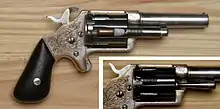 The Slocum, a unique design, was patented on January 27. 1863 (Patent No. 37 551). Later, on April 14, 1863, a patent covering a slight modification of the cartridge ejector system (Patent No. 38 204) and granted to Frank P. Slocum.[2] This circumvented the Rollin White “bored through cylinder” patent which belonged to Smith & Wesson.