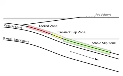 Low frequency earthquakes (LFEs) are seismic events defined by waveforms with periods far greater than those of ordinary earthquakes and abundantly occur during slow earthquakes.[8] LFEs can be volcanic, semi-volcanic, or tectonic in origin,[9] but only tectonic LFEs or LFEs generated during slow earthquakes are described here. Tectonic LFEs are characterized by generally low magnitudes (M<3) and have frequencies peaked between 1 and 3 Hz.[10] They are the largest constituent of non-volcanic tremor at subduction zones, and in some cases are the only constituent.[8] In contrast to ordinary earthquakes, tectonic LFEs occur largely during long-lived slip events at subduction interfaces (up to several weeks in some cases) called slow slip events (SSEs).[11][12] The mechanism responsible for their generation at subduction zones is thrust-sense slip along transitional segments of the plate interface.[13] LFEs are highly sensitive seismic events which can likely be triggered by tidal forces as well as propagating waves from distant earthquakes.[8] LFEs have hypocenters located down-dip from the seismogenic zone,[14] the source region of megathrust earthquakes. During SSEs, LFE foci migrate along strike at the subduction interface in concert with the primary shear slip front.[8]