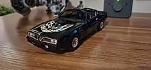 After the debut of the film, the Pontiac Trans Am became wildly popular, with sales almost doubling within two years of the film's release. It outsold its Chevrolet Camaro counterpart for the first time.[34] Reynolds was given the 1977 vehicle used during promotion of the film as a gift, though the car itself never actually appeared in the film. Because of the popularity of the film and the sales success of the Trans Am, the president of Pontiac Alex Mair promised to supply Reynolds with a Trans Am each year. Due to his financial difficulties in 2014, Reynolds put his vast collection of artwork and memorabilia up for auction, including the Trans Am. High estimates for the car were up to $80,000, but the actual sale price was $450,000. Also up for auction was a go-kart replica of the car, which sold for nearly $14,000.[35] In 2015 a Florida-based automobile customization company built 77 Trans Ams modeled after the car that Reynolds drove in the film. These new models were built off the same Camaro platform, came with the Pontiac arrowhead, flaming bird, and Bandit logos, and the instrument panels, center consoles, and hood scoops emulating their 1977 counterparts, and were signed by Reynolds. Some differences included the use of a supercharged 454-CID (7.4-liter) Chevrolet-sourced engine that put out 840 HP, and four round headlights, which appeared on the 1967–69 Firebirds/Trans Ams only; the actual 1977–81 models had rectangular headlights.[36]