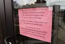 - ↑ Parke C (13 March 2020). "Churches cancel Sunday service, move online amid coronavirus pandemic". Fox News. Archived from the original on 15 March 2020. Retrieved 16 March 2020.