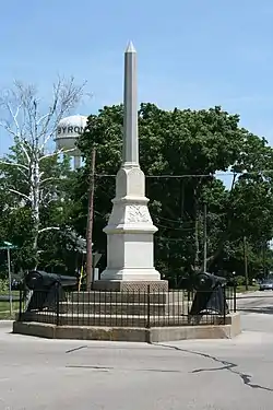 The Soldier's Monument in Byron, Illinois is a marble spire located in the intersection of two streets.[3] In the summer of 1865, shortly after the end of the Civil War, The Byron Monument Association was formed to erect a statue dedicated to the fallen soldiers.[4] The Byron monument was one of the earliest in the state.[4][5] The monument was erected in 1866 and constructed by builders Heard and Lindsley for $1,400.[3][4] It is made of Rutland white marble.[5][6] The monument was dedicated on October 16, 1866.[2]