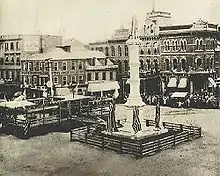 Centre Square, as the present-day Penn Square was called at the time,[1] was chosen as the site of the new Soldiers and Sailors Monument. The monument was formally commissioned on November 4, 1872.[1] It was formally unveiled and dedicated on July 4, 1874, and was originally surrounded by stockade fencing and dirt streets at the time.[2] President Ulysses S. Grant sent his regrets for being unable to attend the ceremony.[2] The large crowd which watched the dedication included Civil War veterans and a group of girls from the Mount Joy Soldiers Orphan Home. The Soldiers and Sailors Monument was officially dedicated at 1:00 pm while the girls from the orphanage sang My Father's Grave.[2] The Genius of Liberty on top of the monument was draped in an American flag.[2]
