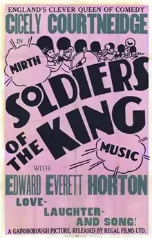 Soldiers of the King is a 1933 British historical comedy film directed by Maurice Elvey and starring Cicely Courtneidge, Edward Everett Horton and Anthony Bushell.[1] It was Courtneidge's fourth film, and the first she appeared in without her husband Jack Hulbert.[2] Courtneidge plays the matriarch of a music hall family, in a plot that switches between the Victorian era and the 1930s present.